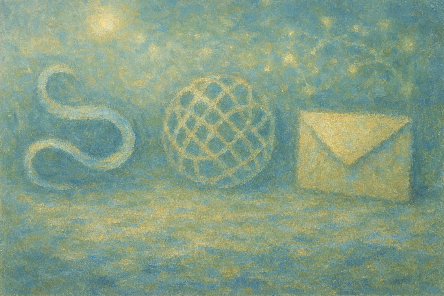 Een Monet-achtig schilderij van een digitale landschap, waarin content marketing, zoekmachinemarketing, social media en e-mailmarketing samenkomen als een orkest met elegante precisie.