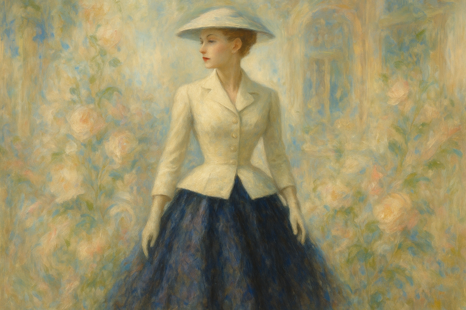 Een Monet-achtig schilderij van een vrouw in de 'Bar Suit' van Dior's New Look uit 1947. Ze heeft een strakke taille en een volle rok, staand tegen een zachte, impressionistische achtergrond van Parijse straten.