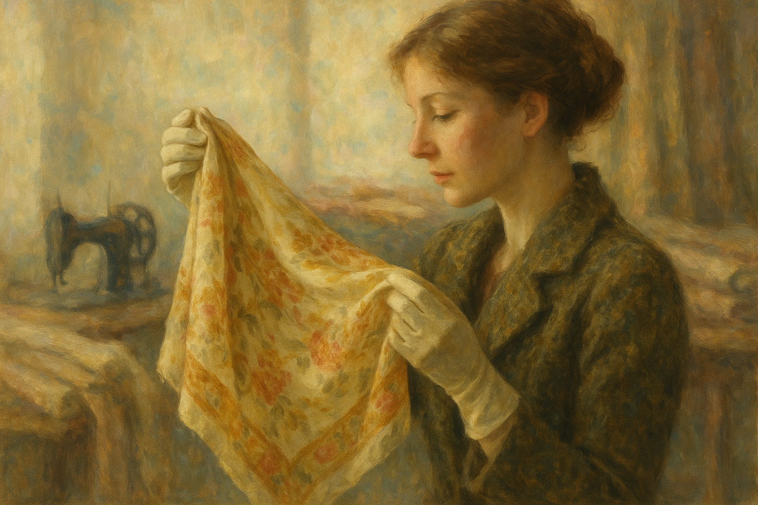 Een Monet-achtig schilderij van een elegante vrouw die met aandacht een vintage kledingstuk bekijkt in een zonnige boetiek, met op de achtergrond andere klassieke stukken aan een rek.