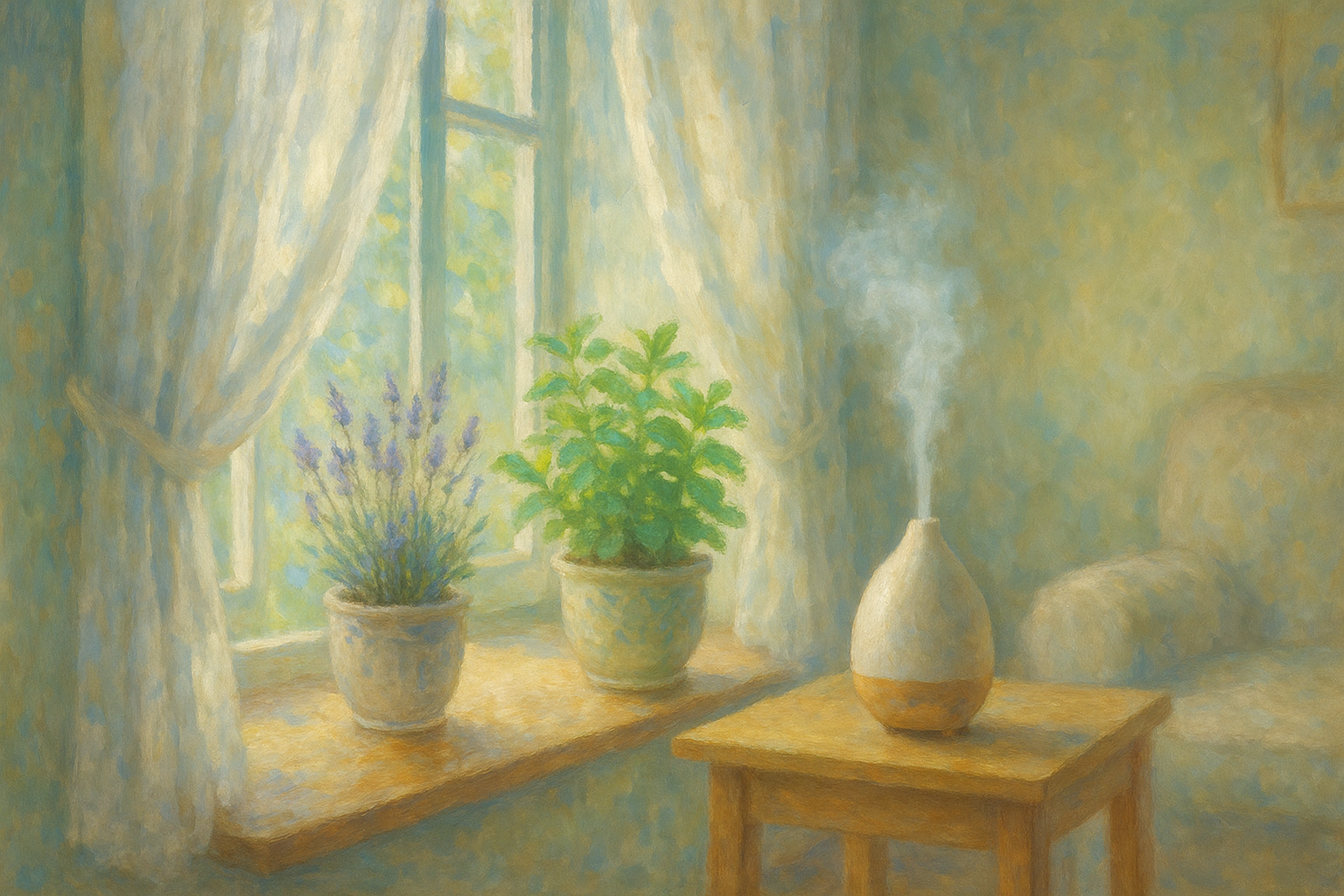 Een Monet-stijl schilderij van een vredige kamer badend in zonlicht, met een venster dat uitkijkt op een tuin. Een diffuser, lavendel en pepermunt symboliseren natuurlijke bescherming.