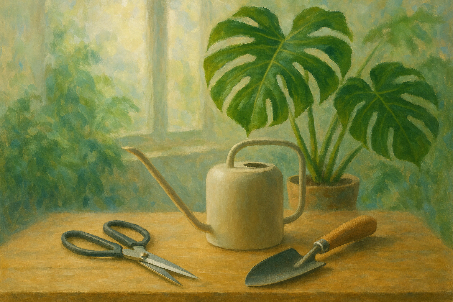 Een Monet-stijl schilderij van een paar scherpe snoeischaren en een kleine gieter, rustend op een houten oppervlak, met een wazige achtergrond van weelderige groene kamerplanten.